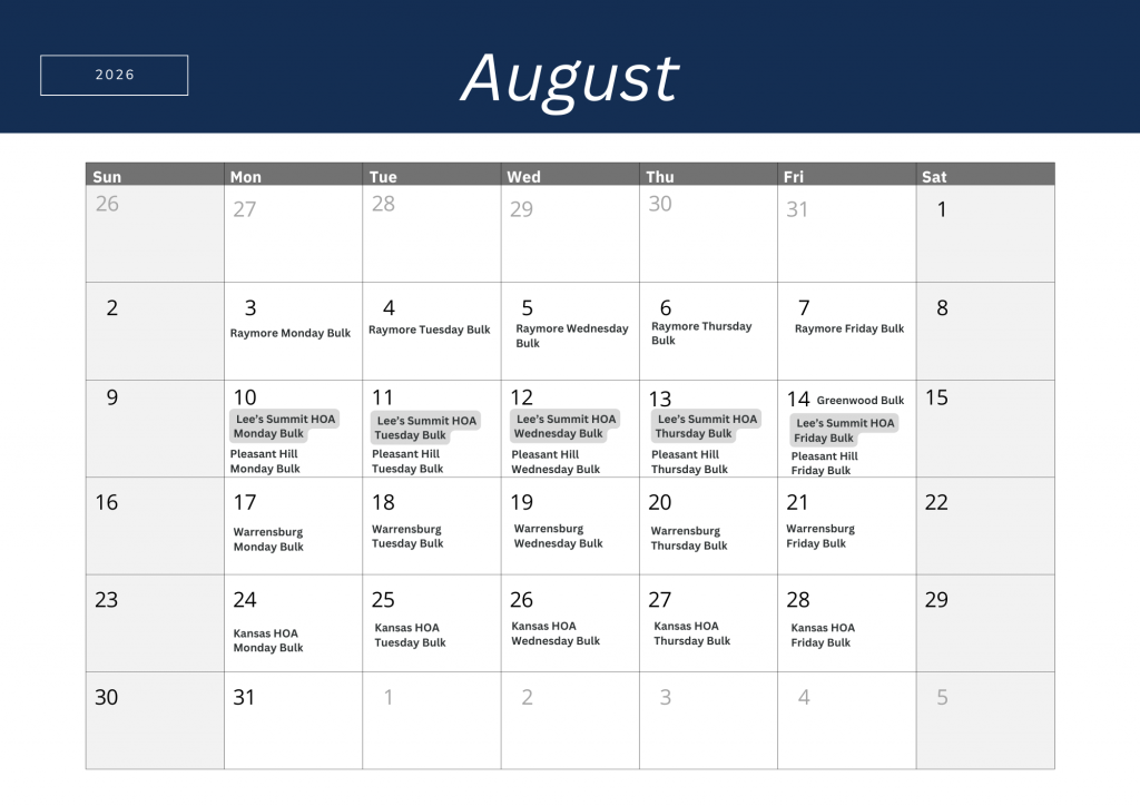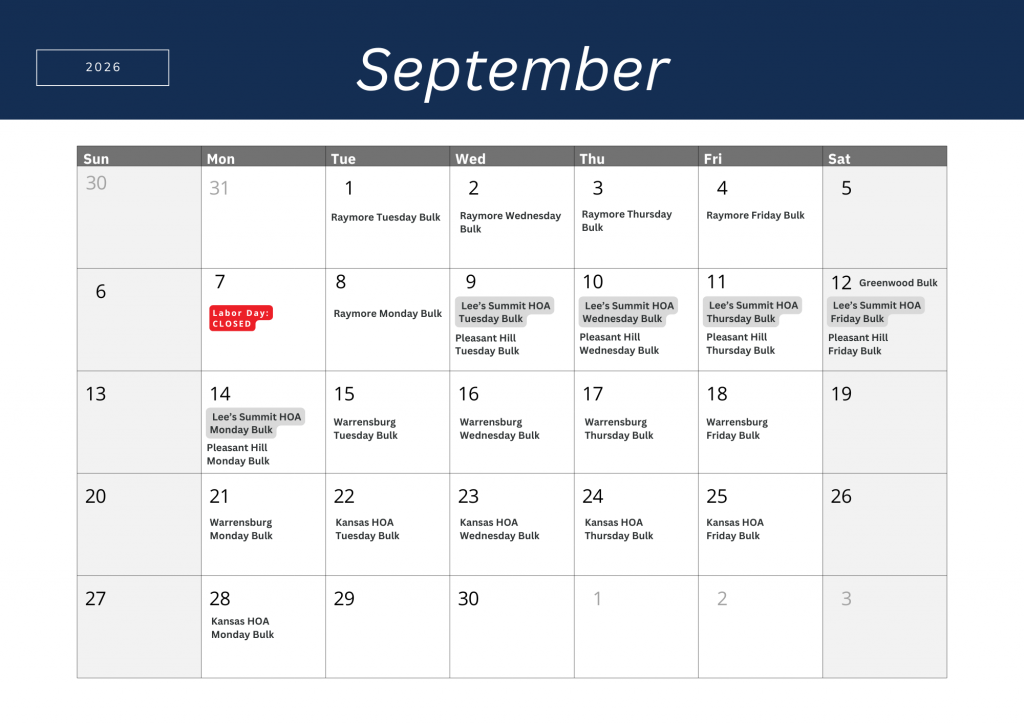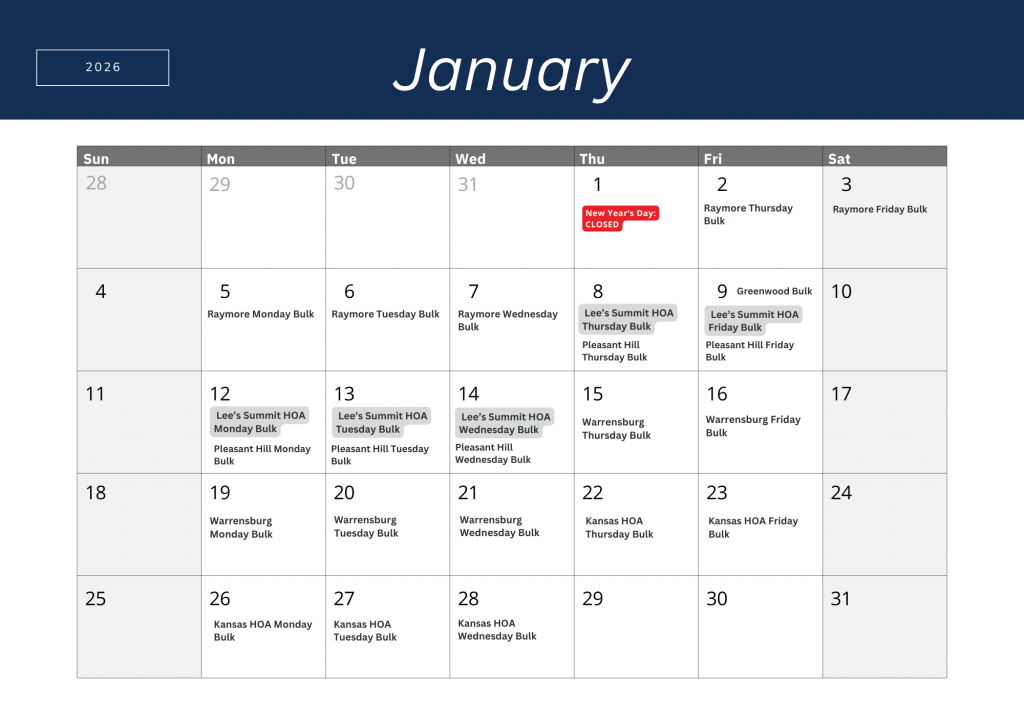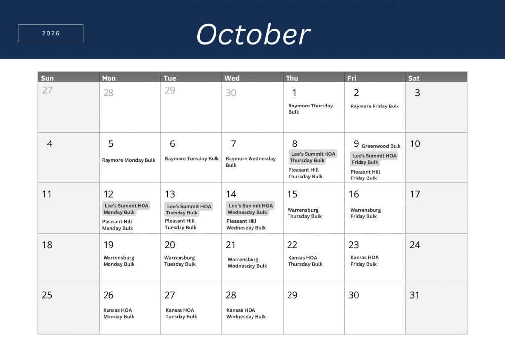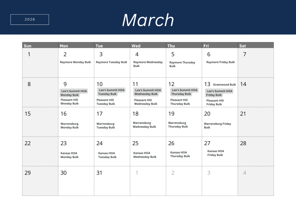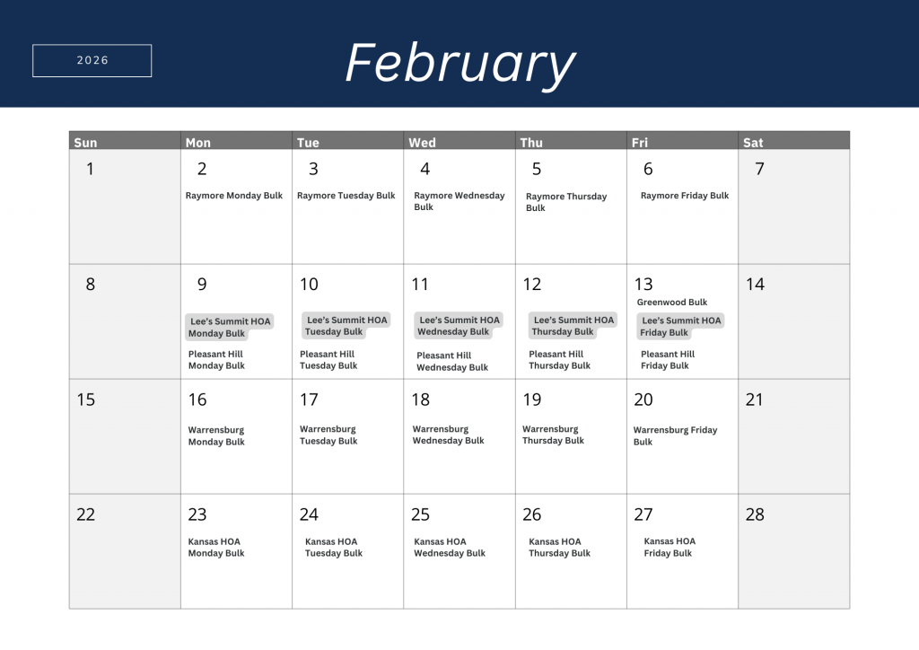 This calendar is for municipalities and homeowners associations. Please visit your dedicated web page for more information on which items are included.