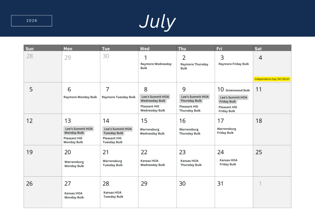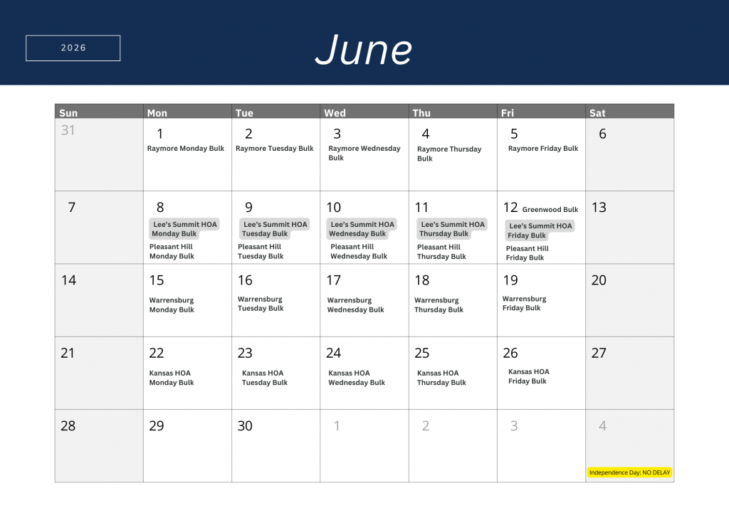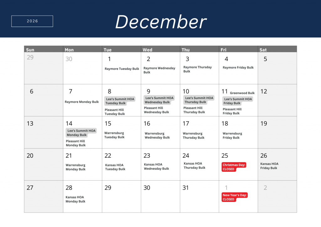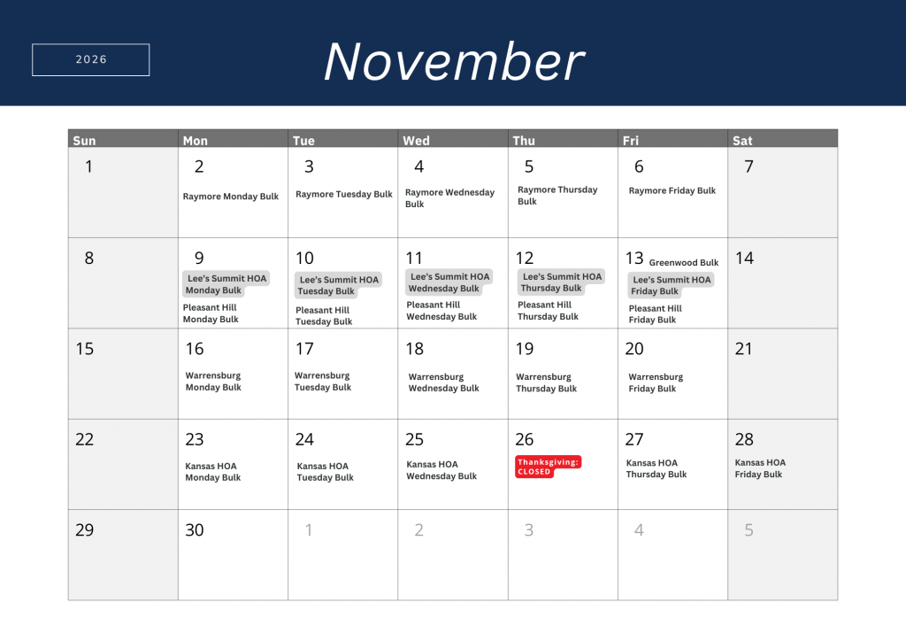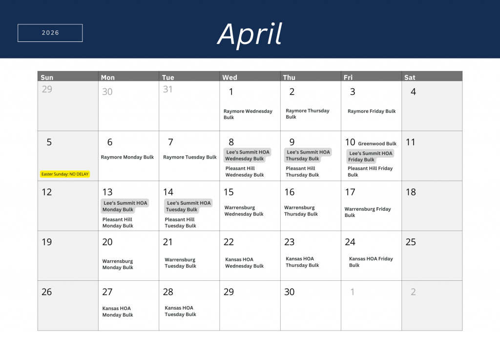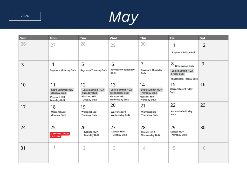 This calendar is for municipalities and homeowners associations. Please visit your dedicated web page for more information on which items are included.